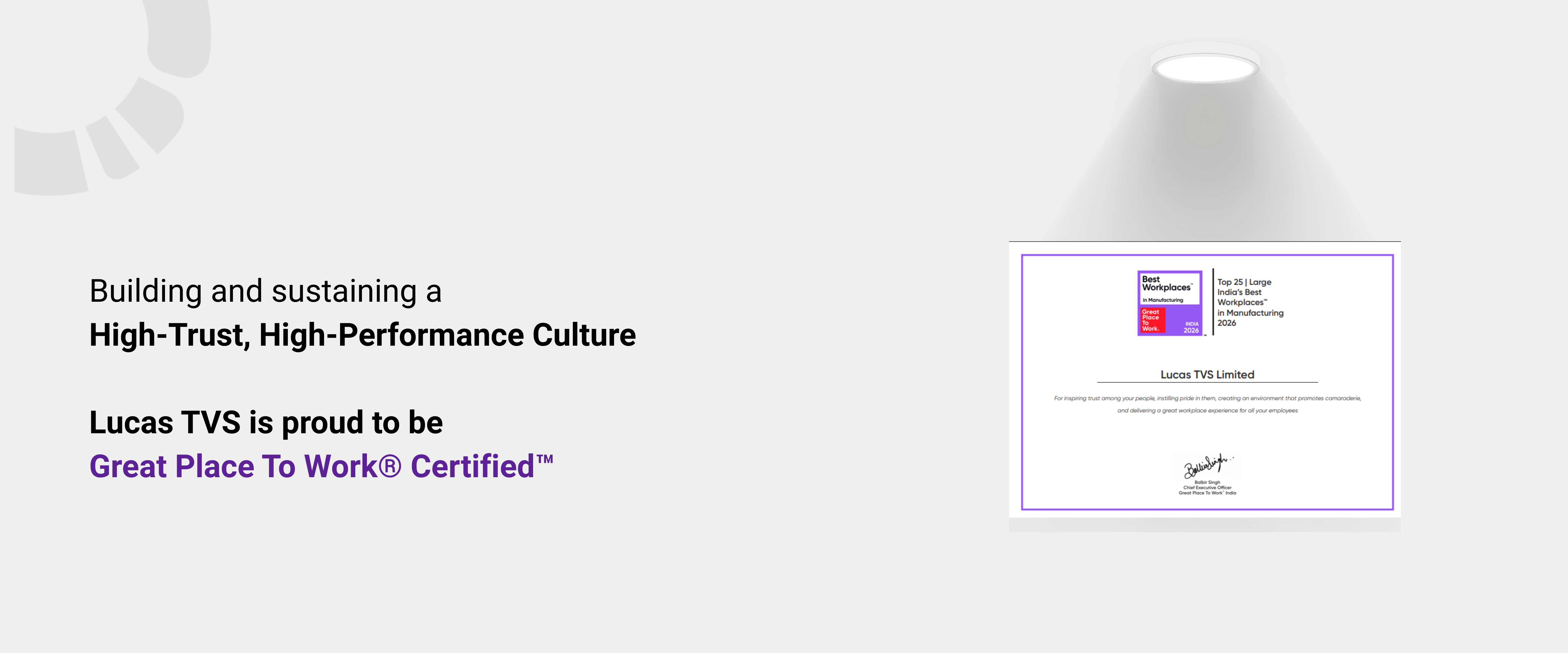 Great workplaces don’t happen by chance. They are shaped every day by leaders who listen, teams who collaborate, and people who believe in doing what they say. In 2026, Lucas TVS was recognised among India’s top 25 Best Workplaces in Manufacturing – Large Category, affirming a culture where trust, pride, and camaraderie power performance.